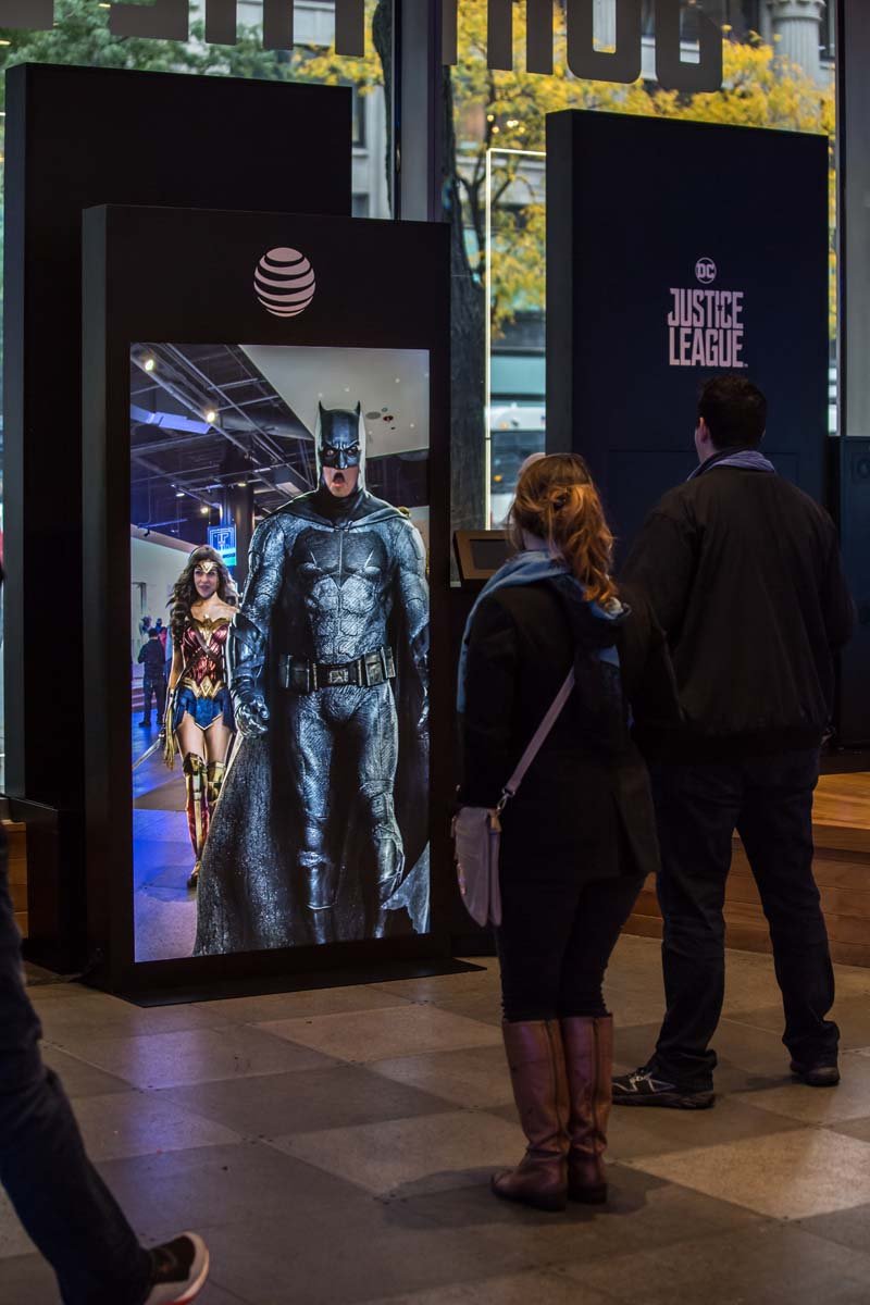 For the release of Warner Bros Justice League, we created this touch free Augmented Reality experiences which allowed pedestrians and consumers to digitally become one of the Justice League DC Characters. Using skeletal tracking, Super Hero costumes were overlaid on 4K video feeds both on the street and inside the store.