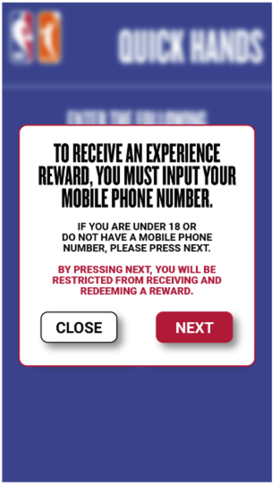 “SMS messages are used. Data rates may apply. To receive an experience reward, you are required to input your mobile phone number.”