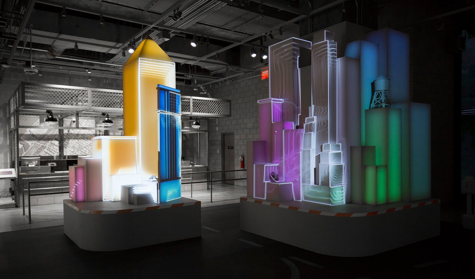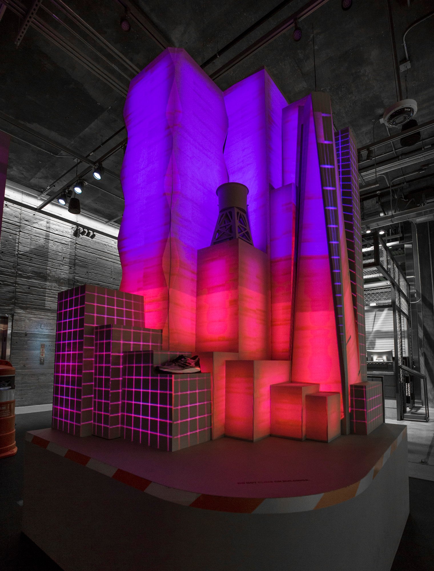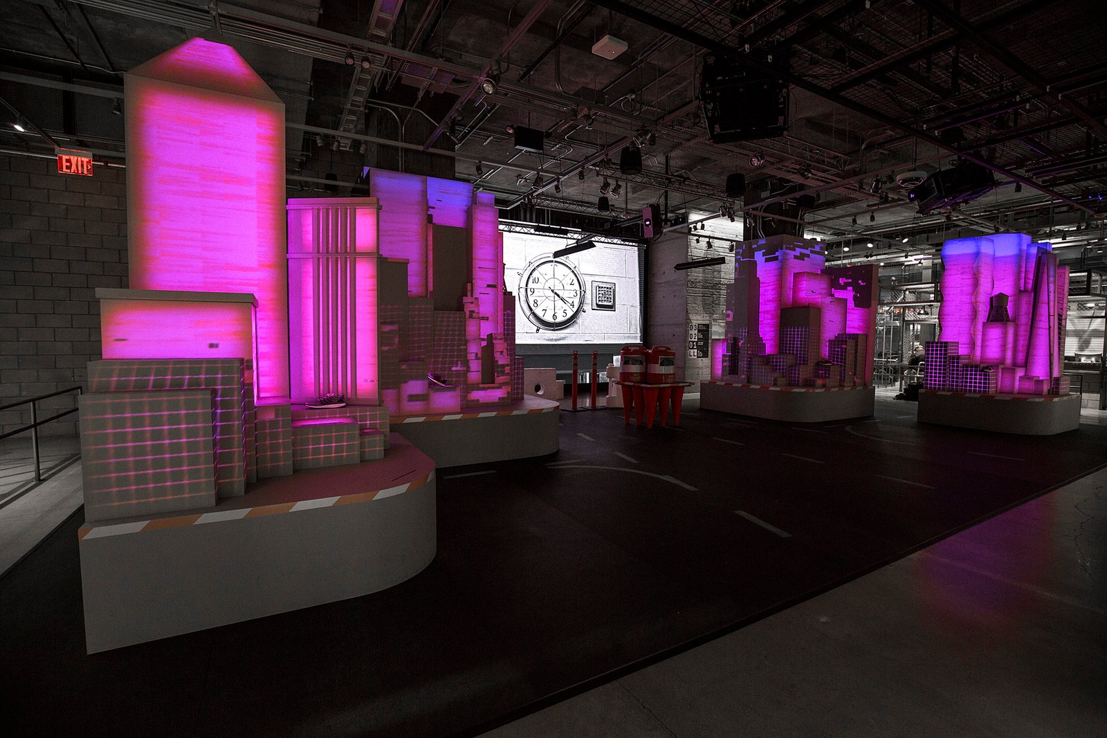 Our teams brought to life a massive, video-wrapped city scape in the central corridor.  We focused on forms and arrangements of buildings ideal for full activation with video projection, and building custom animations and content for each arrangement along with brand and creative teams.