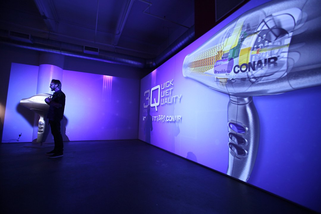 We created all the visuals from scratch using 3D Autocad models given to us from the factory technicians.  ConAir was such a great client to work with that they even sent us a to scale model of the dryer custom built for video mapping tests.  the final sculpture was 5Ft wide and covered with 14,000 lumens.  Everyone loved it.