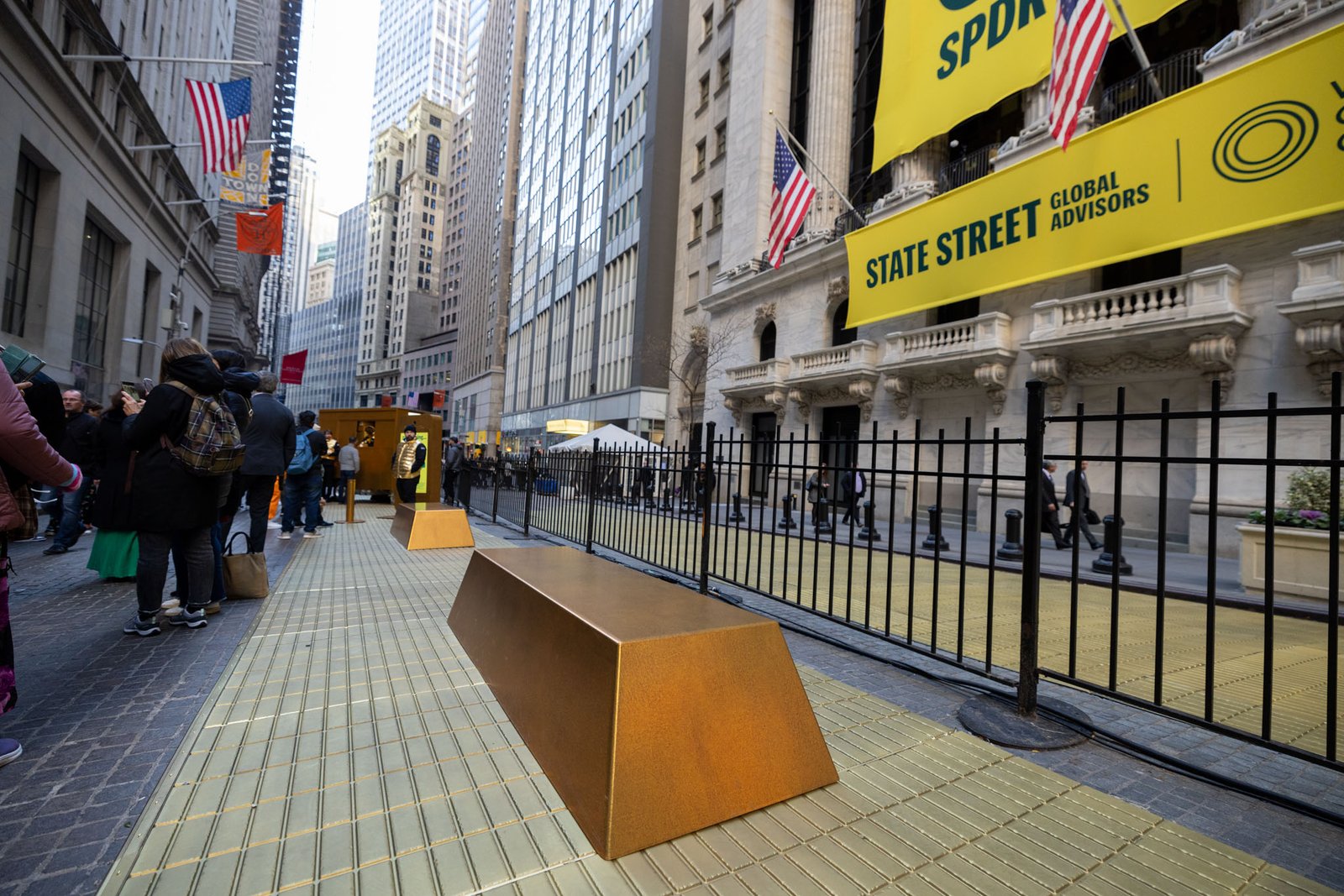 2500 sq/ft of custom built gold bars lined the street leading to the New York Stock Exchange. This commemoration of the 20th anniversary of gold ETFs was seen by thousands of people visiting Wall St.