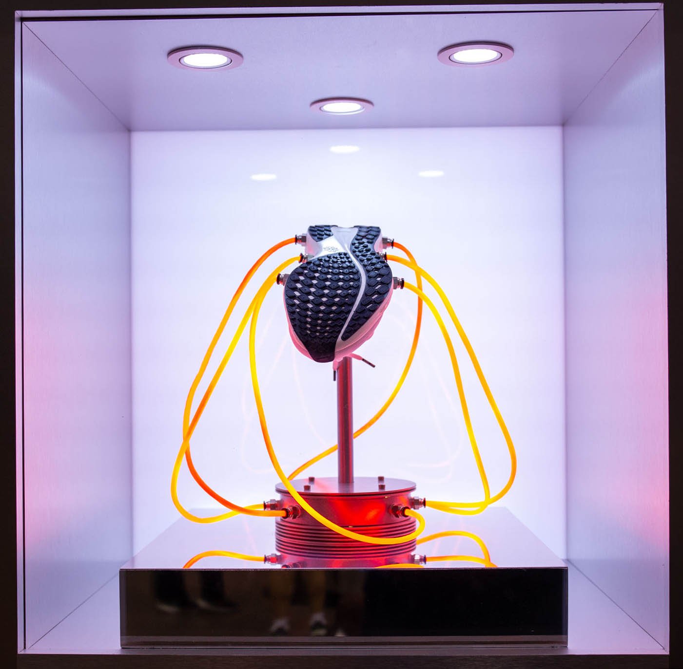 The display fixtures included elements such as 3′ custom plasma tubes, Video LED backlit CNC map of Manhattan, inlayed with polished stainless steel, 4 different experiments showcasing the technology of the shoe.