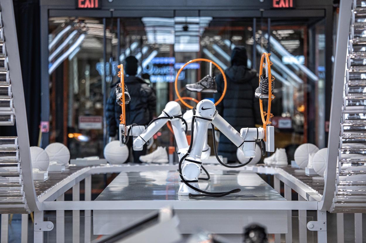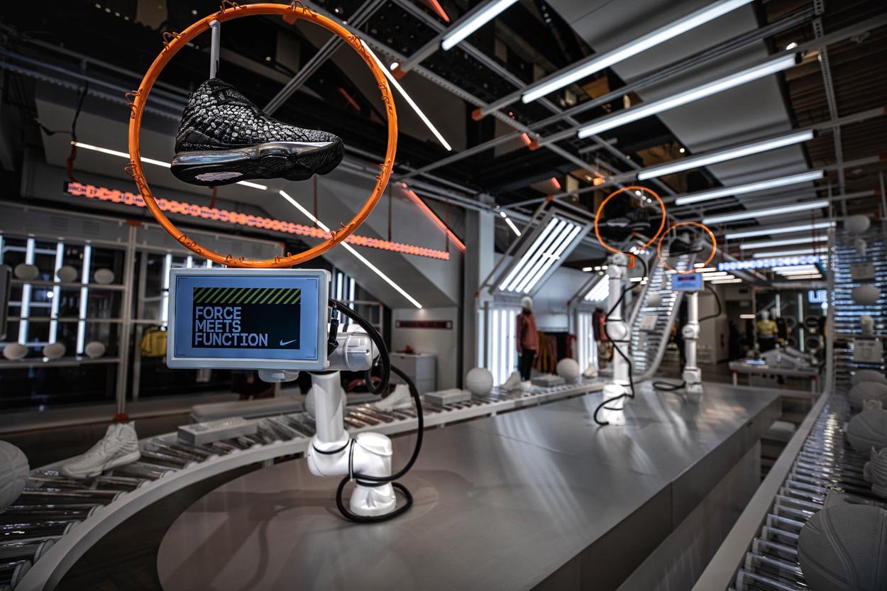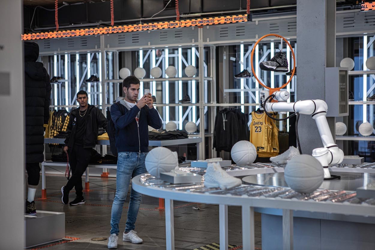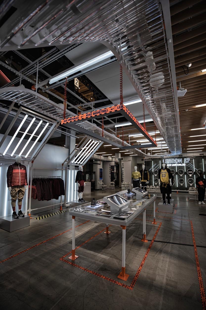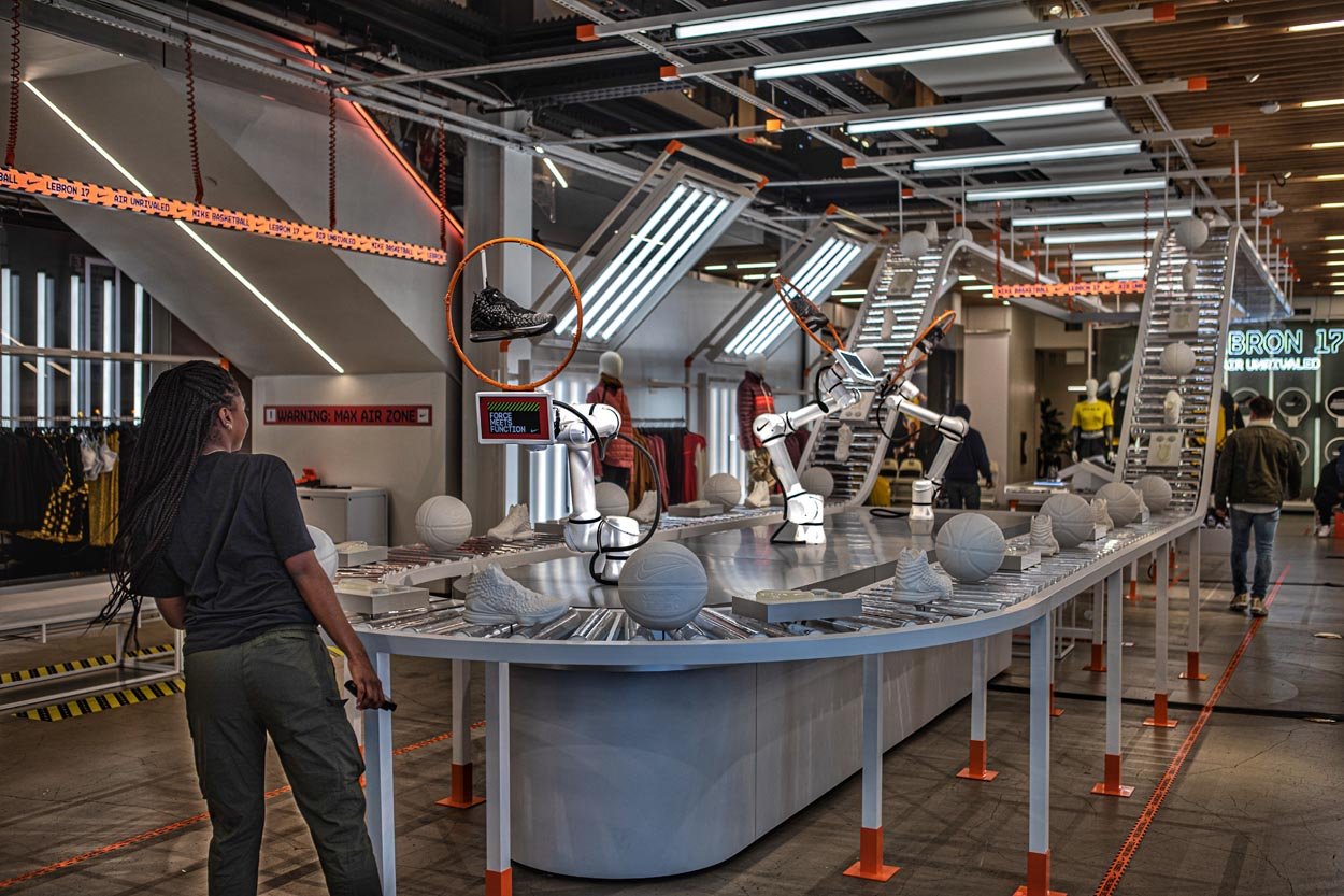 These highly customized robotic arms are choreographed in sequenced movements that showcase all the new features of the Lebron 17. Using computer vision and skeletal tracking, the lead robot tracks users in the store and follows their movement, showcasing the Lebron 17 shoe directly at the consumer. See if you can bust a move on the lead robot that ‘defends’ the court by mirroring your movements in real time.