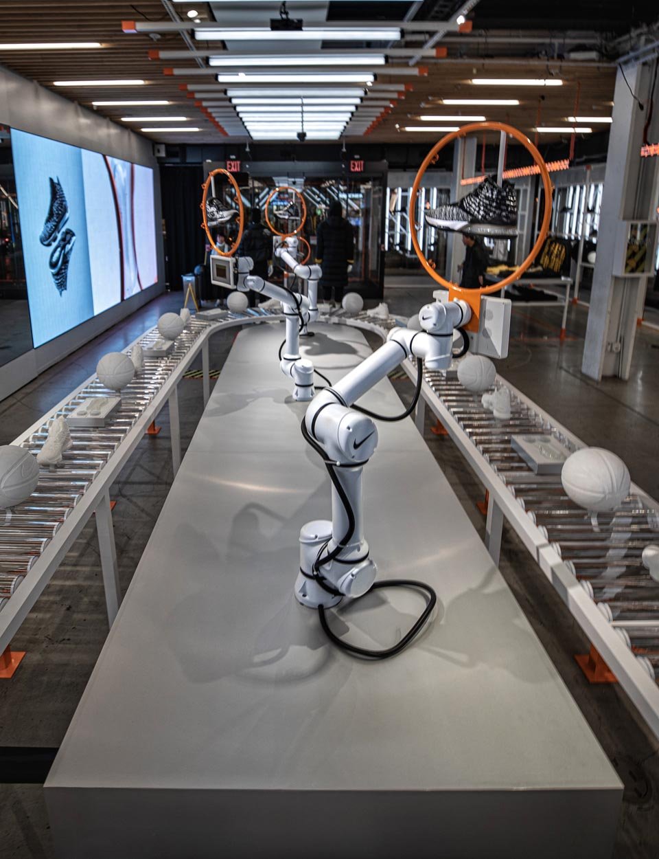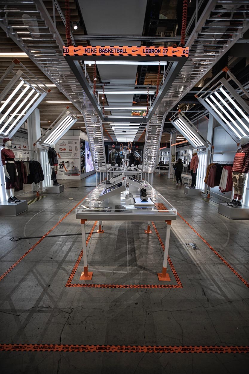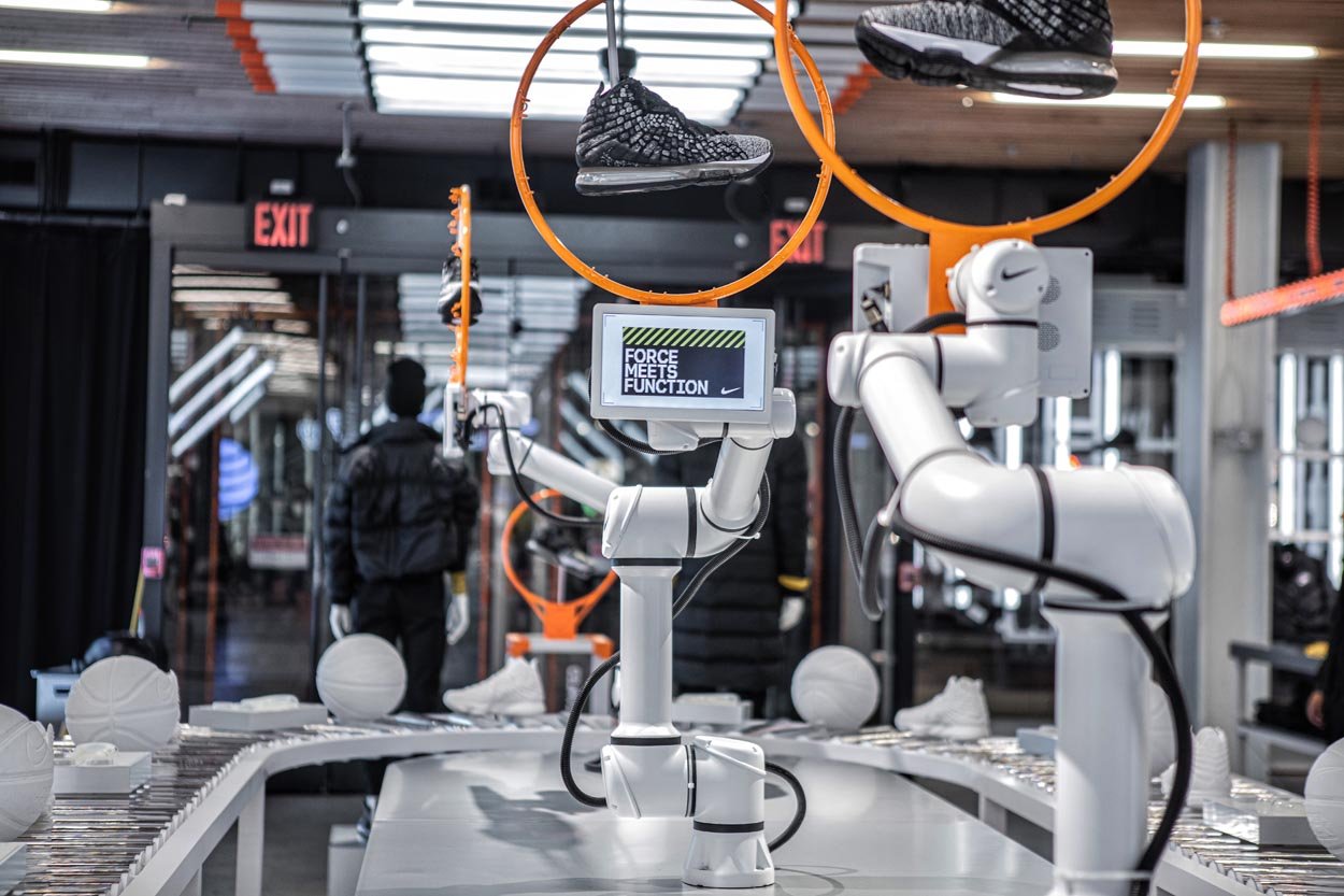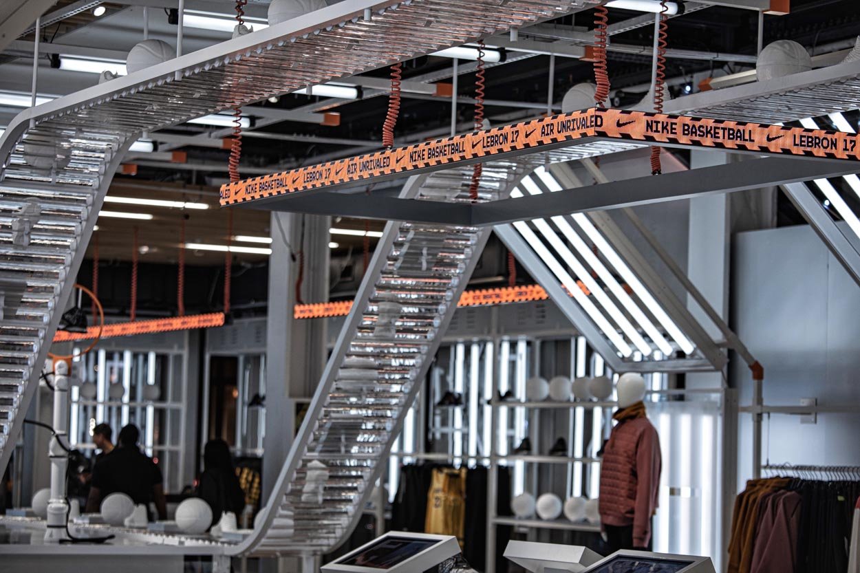 These highly customized robotic arms are choreographed in sequenced movements that showcase all the new features of the Lebron 17. Using computer vision and skeletal tracking, the lead robot tracks users in the store and follows their movement, showcasing the Lebron 17 shoe directly at the consumer. See if you can bust a move on the lead robot that ‘defends’ the court by mirroring your movements in real time.