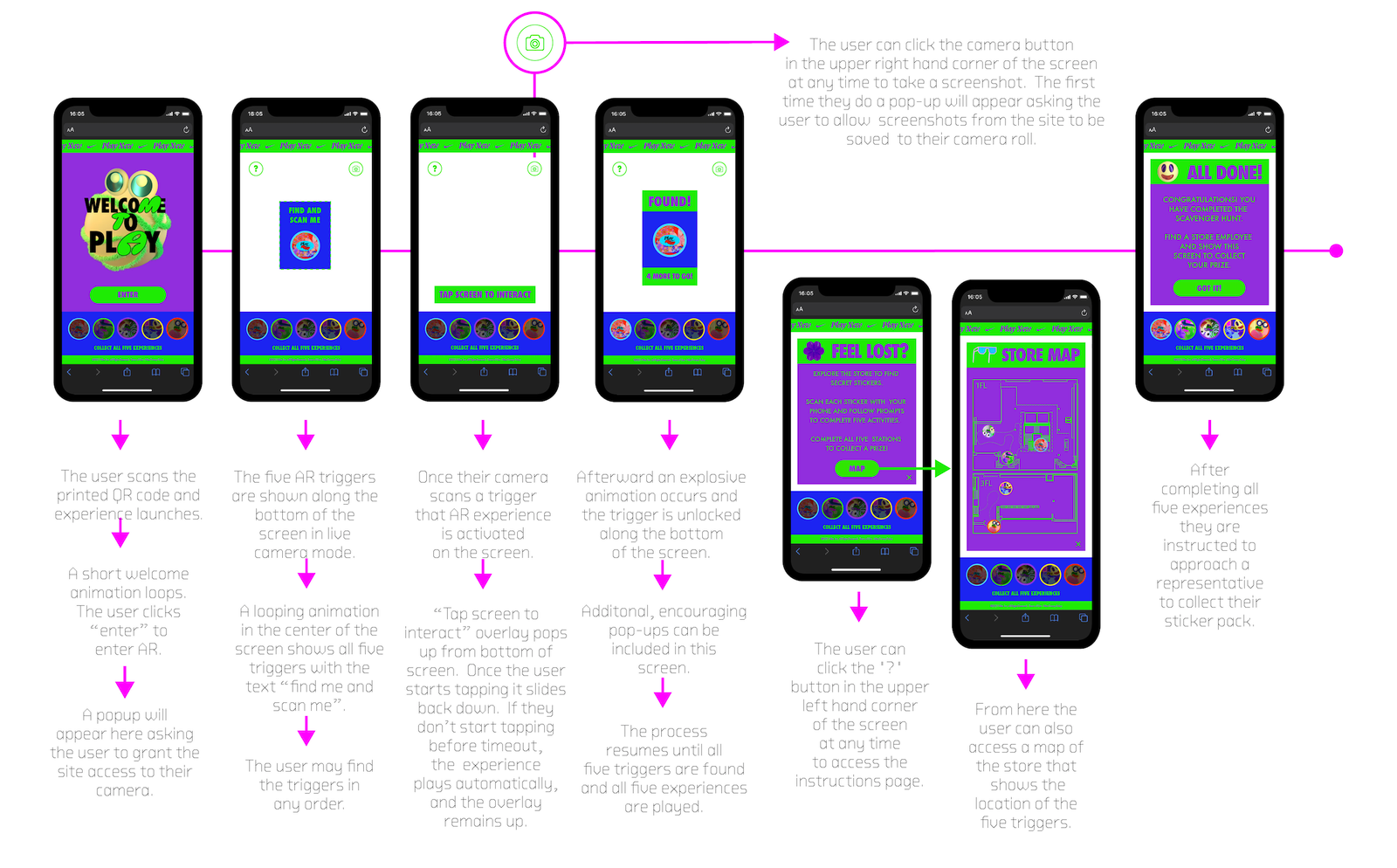 Users hunt through retail environments for AR triggers that activate games.  After playing each game users receive a medallion.  Collect all 5 medallions and receive a ‘gift with experience’ at the end!