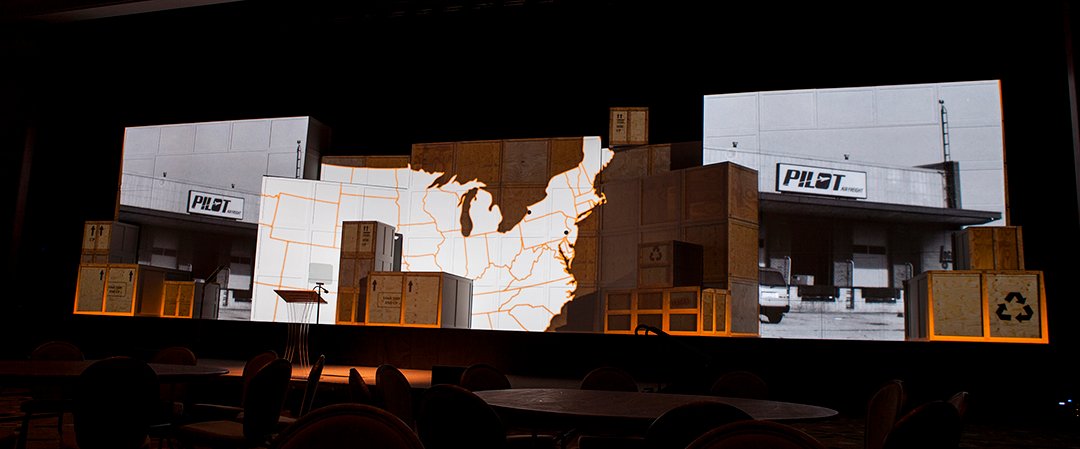 Over the course of three days the video mapped set rotated between ambient loops of custom content during dinner, a video of Pilot’s history produced especially for the set, and multiple keynote presentations.