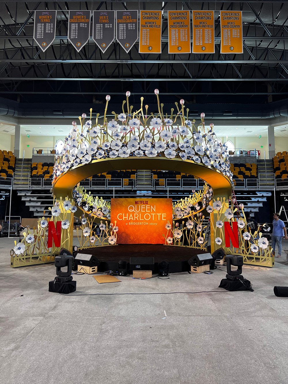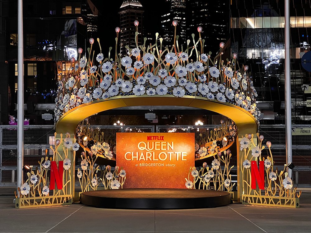 For the launch of Netflix’s Queen Charlotte, BRDG Studios designed, fabricated and activated a massive jeweled crown in most of the major markets on the west coast. LA, New Orleans, San Diego, Seattle and Portland were some of the stops. The stage was used to activate concerts, photo ops and brand activations in every market at varying sizes.