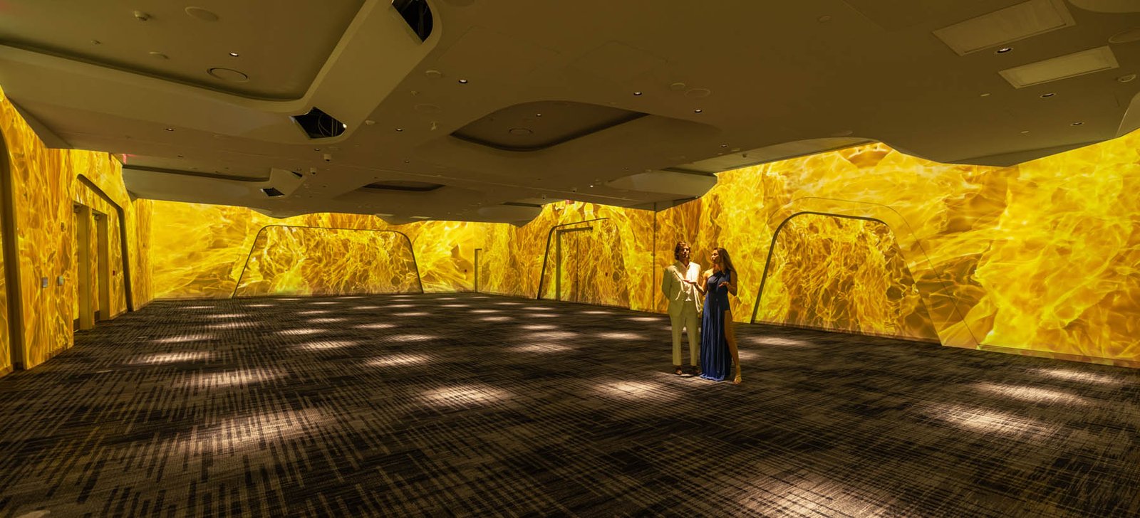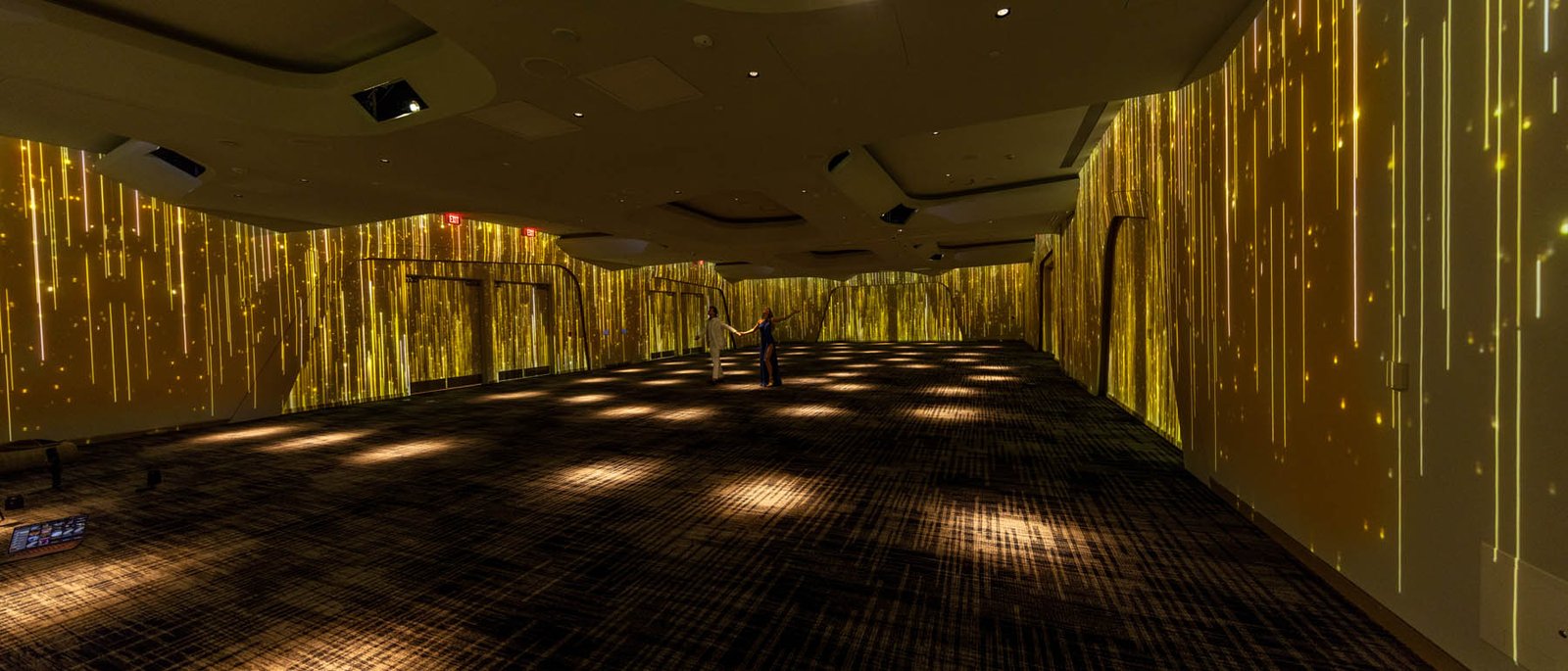 It is comprised of 22 video mapped projectors, seamlessly blended together to create a 360 degree immersive digital environment.