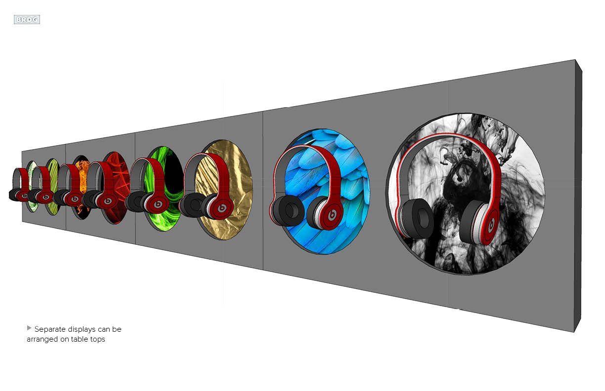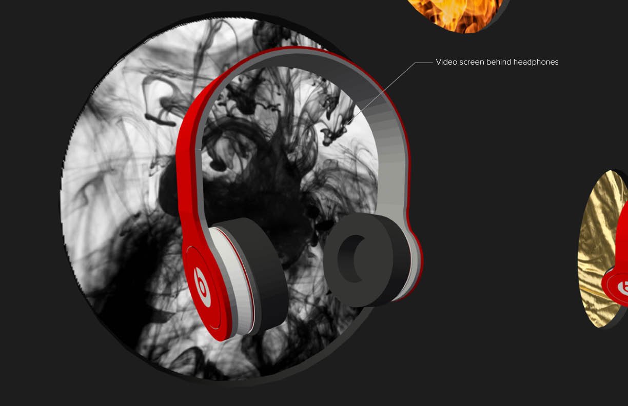 This was something we proposed to showcase a specialty line of Beats headphones. The idea was to create 7 pieces of content that told a story behind each pair of headphones on a custom display with a touch screen built in. More from BRDG...