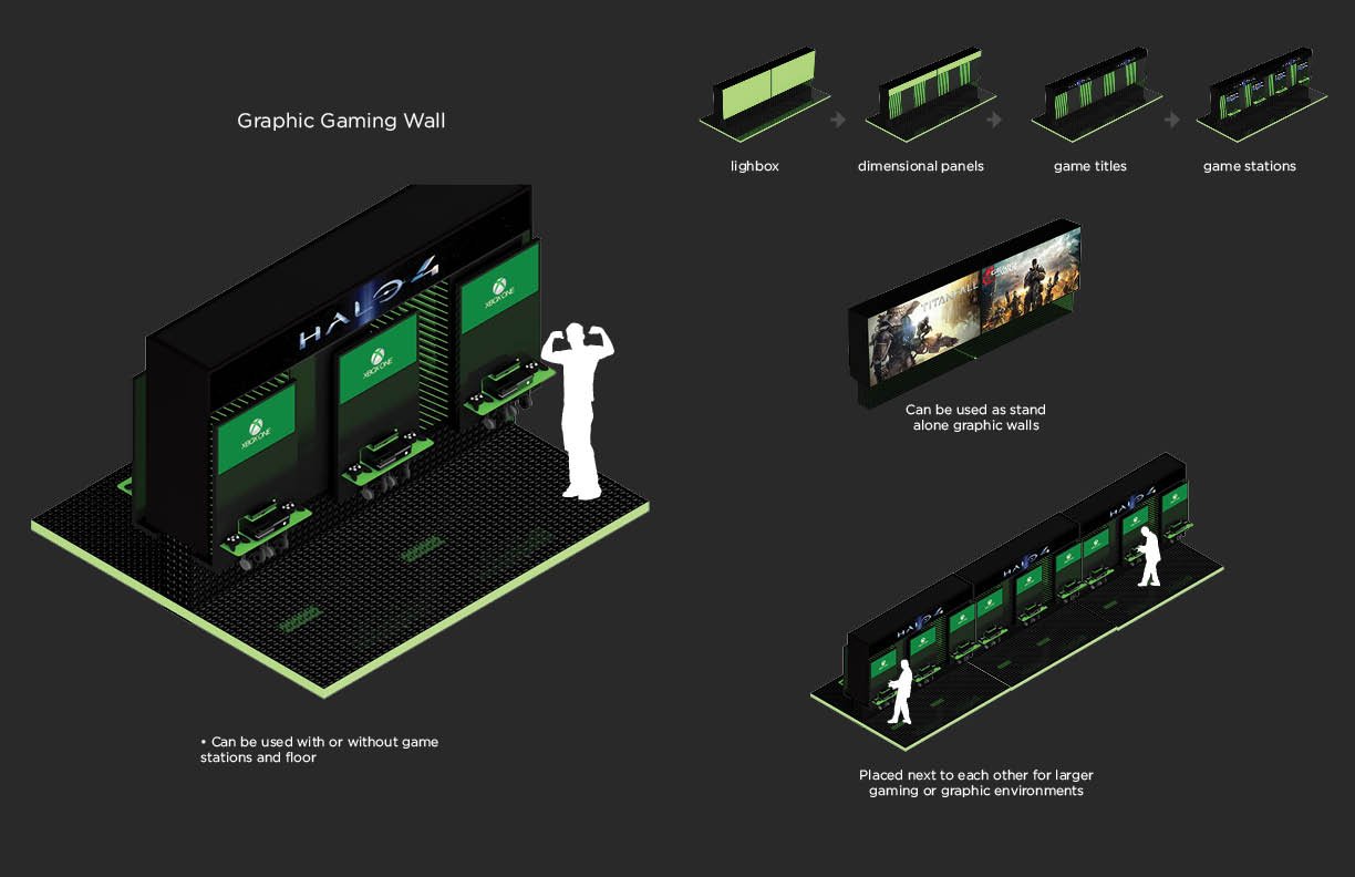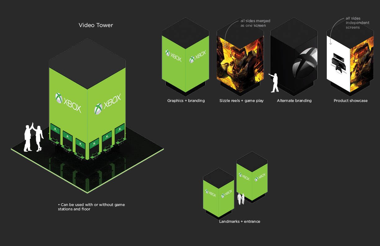 This is an excerpt from a pitch that used video environments, video projection towers, and modular production solutions to address Xbox’s activations in convention centers and trade shows i.e. Comic Con.
